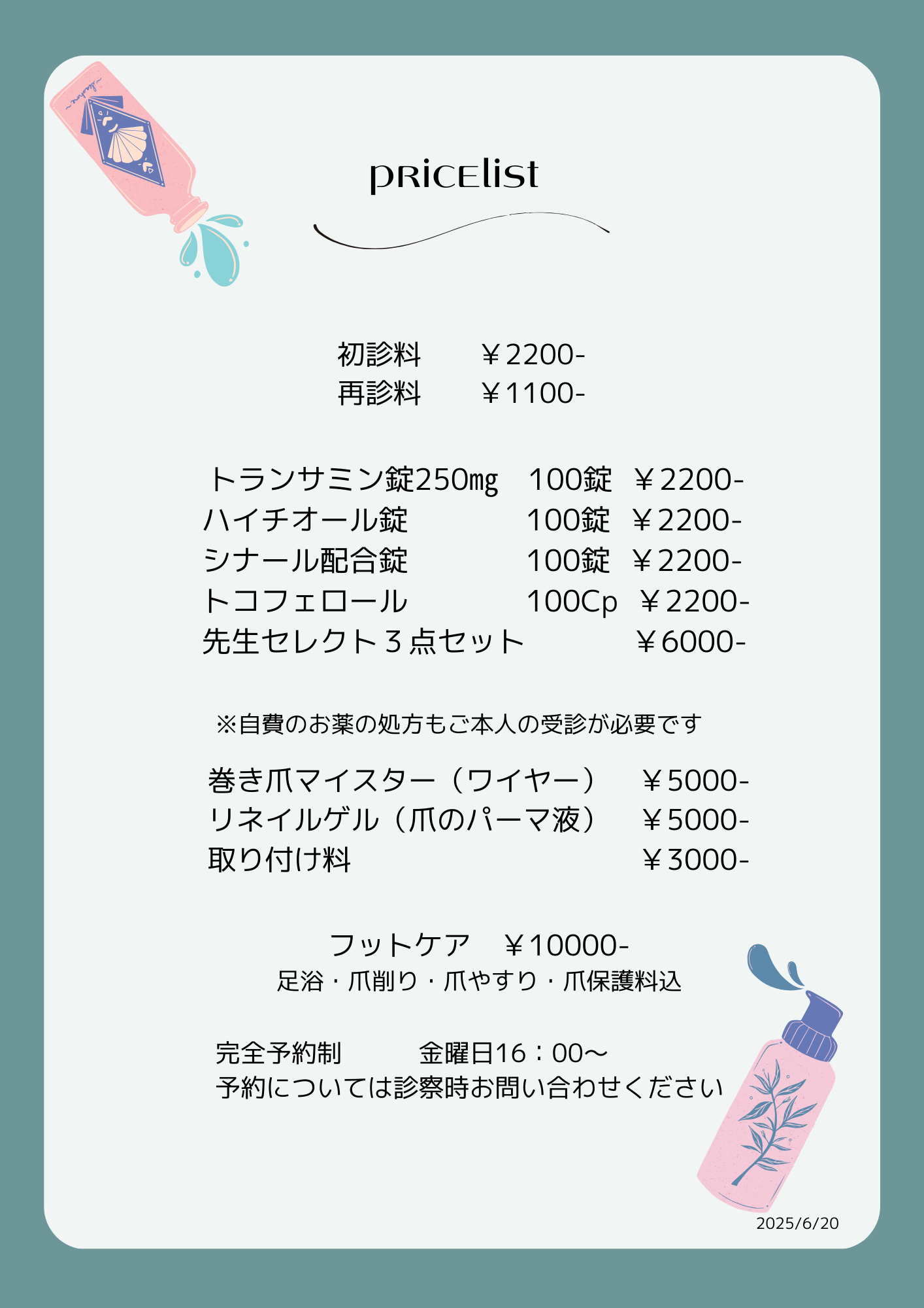 足浴・爪削り・爪やすり・爪保護料込 ¥10.000-
